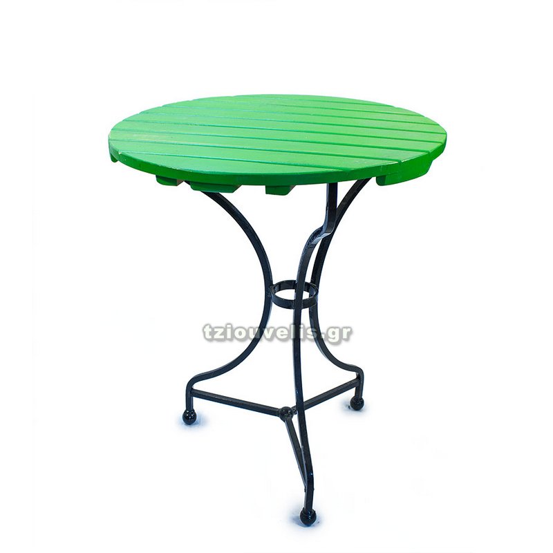Μεταλλικό τραπέζι παραδοσιακό. Βάση μεταλλική μασίφ και καπάκι ξύλινο (φέτες). Σε διάφορα χρώματα